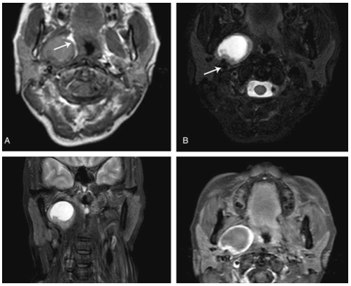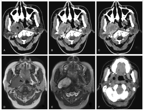 一位52岁的中国女性于2017年1月被送到耳鼻喉科门诊,主诉是喝草药酒后喉咙痛。体格检查显示右侧咽外侧壁肿胀,咽喉红肿,无异常分泌物或溃疡。口外检查肿胀、压痛或淋巴结肿大均隐形。增强型计算机断层扫描(CT)和磁共振成像(MRI)扫描显示右侧PPS主要为囊性肿块,直径为33mm。这种定位良好的肿块在静脉注射钆后表现为周边增强(图1)。