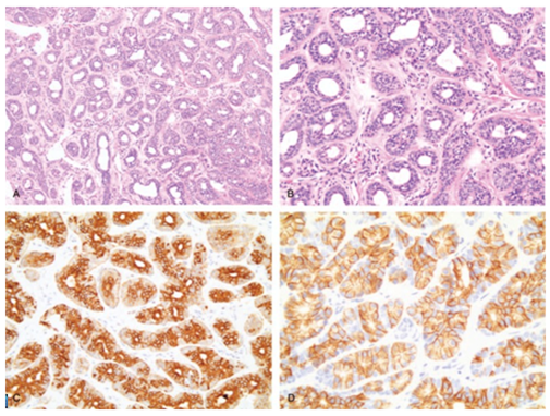 全麻下经口入路100分钟内切除肿瘤,肿瘤呈乳白色包膜,直径40×30mm。术中出血量为100mL。术中冰冻切片显示肿瘤起源于涎腺上皮细胞。常规组织病理学检查显示肿瘤由两层排列成管状和筛状结构的基底样细胞构成。最终诊断为BCA在右PPS。