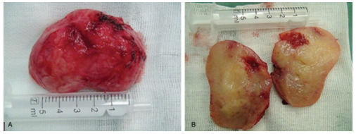患者在全麻下经口气管插管行经口肿瘤切除术。常规使用扁桃体切除术的位置。取出右扁桃体,切开口咽右外侧壁和部分咽上缩肌后,暴露出含有闪亮液体的肿块(图2)。术中冰冻切片显示肿瘤起源于涎腺上皮细胞,首先提示为BCA。然后,仔细分离肿瘤,发现它附着在腮腺外侧,但不附着在颈内动脉、颈静脉或任何神经上。手术时间60 min,无神经血管损伤。术中出血量为50mL,常规使用经验性抗生素预防术后感染。
