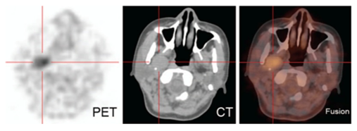 一位41岁的中国女性于2014年11月来到我们的耳鼻喉科门诊,她有2个月的咽异物感觉史。体检发现咽部轻微发红,肿胀、压痛或淋巴结肿大阴性。MRI显示在右PPS中有圆形和明确的肿块,大小为30×20μmm。由于有胃底类癌的病史,经胃镜取出后,建议病人接受18F-脱氧葡萄糖正电子发射断层扫描(18FDG PET)-CT检查,以区分转移性淋巴结与良性淋巴结。PET图像显示18FDG在右侧PPS中摄取增加,与CT上的肿块形状相对应(图7)。没有观察到胃底肿块或增加的摄取。无其他淋巴结、肺或肝转移明显。