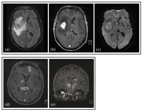 图1 两名患有原发性中枢神经系统淋巴瘤(PCNSL)的患者(a-c,d和e)的脑磁共振成像(MRI):( a)轴向液体衰减反转恢复(FLAIR)序列,显示由高信号水肿包围的低信号病变; (b)轴向,T1加权,对比度增强序列,具有强烈的均匀对比度增强; (c)扩散加权轴向序列,显示病变中的明亮信号,表明扩散受限。(d,e)轴向和冠状T1加权,对比增强序列揭示多焦点对比增强的PCNSL病变。