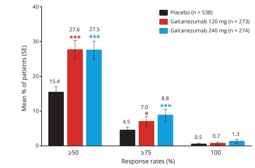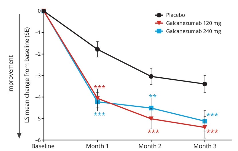 患者基线MHD为19.4天。2个剂量Galcanezumab治疗组MHD均较安慰剂组显著减少(安慰剂组减少2.7天,120mg组减少4.8天,240mg组减少4.6天),如下图所示。