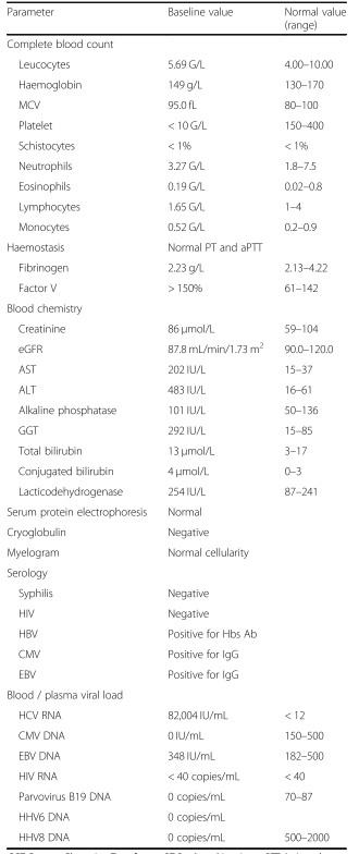 那时,患者的天冬氨酸转氨酶(AST)(6倍上限(ULN)),丙氨酸转氨酶(7*ULN)稍有升高,且与HCV病毒载量相关(图1)。没有其它病毒(如巨细胞、细小病毒、人乳头瘤病毒等)复制的证据。冷球蛋白阴性。行骨髓穿刺术:细胞结构正常,巨核细胞数量增加,红细胞生成和骨髓细胞生成均正常,于是确诊为急性HCV感染继发了ITP。