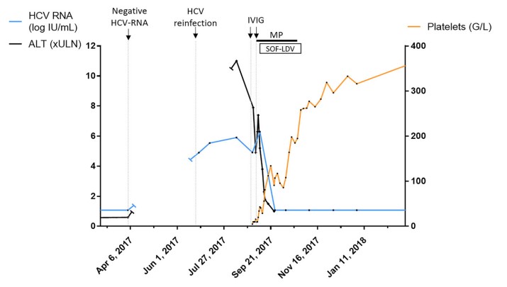 作者描述了一例急性HCV再感染导致严重的ITP一例。由于IVIG在慢性HCV感染中,对和继发性ITP疗效好,在该病例中被作为一线治疗方案。但IVIG对血小板计数无改善,便以IVIG联合甲泼尼龙作为第二个疗程,该方案稍稍改善了血小板减少症。后来又开始了索非布韦-雷迪帕韦治疗,而该方案迅速降低了病毒载量并将血小板计数提高到正常范围。有趣的是,停用类固醇后,未见血小板计数再次下降。