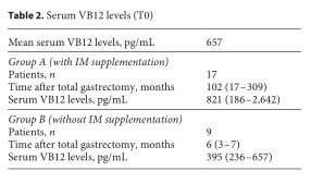 结果显示,本研究纳入26例患者,A组患者17例,B组患者9例,平均年龄为64岁,全胃切除术后平均随访65个月,病人特点见表1。A组和B组患者的血清维生素B12水平见表2。