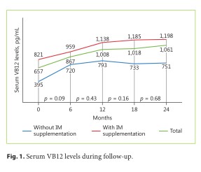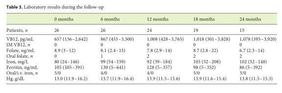 两组患者中,没有一例患者出现维生素B12缺乏相关并发症,所有患者口服血清维生素B12水平后均正常,没有人接受肌肉注射的维生素B12。两组中维生素B12水平在6个月,12个月,18个月和24个月统计学无统计学意义,如图1。前3个月所有患者贫血发生率为19%,在第十二月降低至7%,无巨幼红细胞贫血患者,见表3。