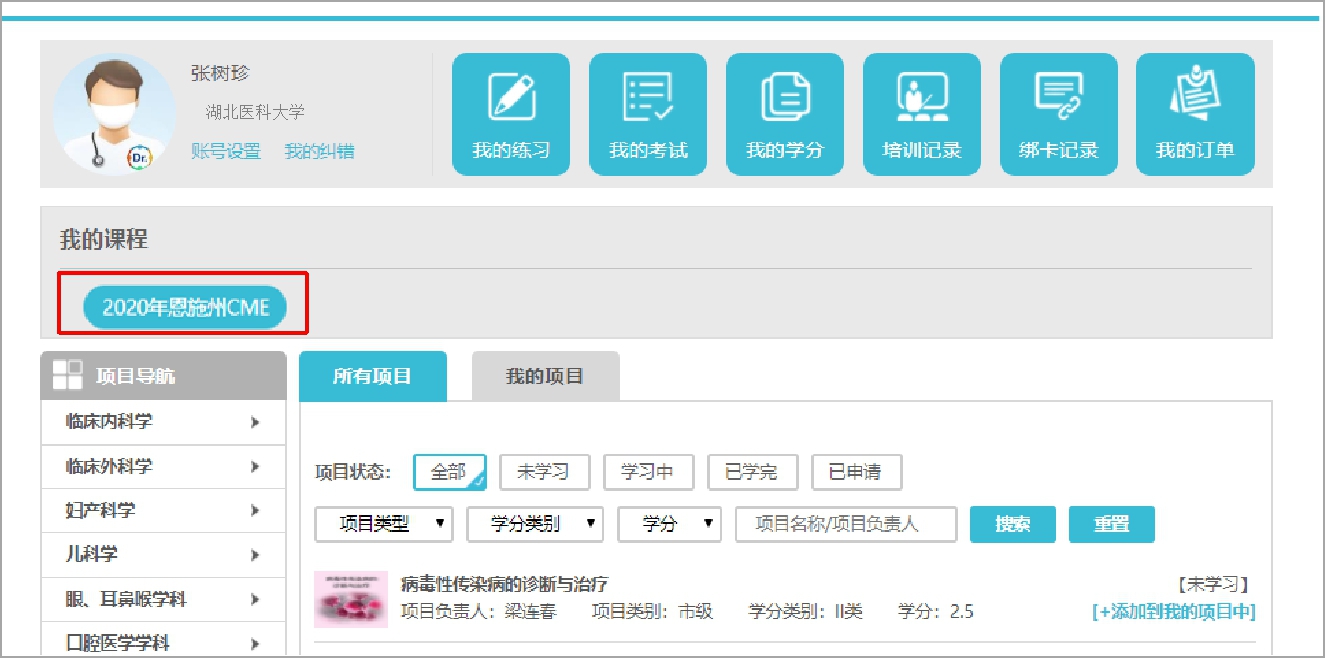 登录成功进入到个人学习中心后,点击“2020年恩施州CME”选择项目进行学习。项目学习合格要求为:课程视频学习达到90%以上+课后考试100分。