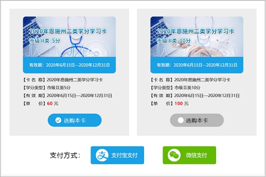 您可以根据实际需求选择购买“市级II类5分”或“市级II类10分”学习卡,线上购卡支持支付宝、微信付款,小编在此特别提示:学习卡一经购买不予退款,因此付款前请您务必核对登录用户信息,确认是否将购买的学习卡绑定到登录用户下。