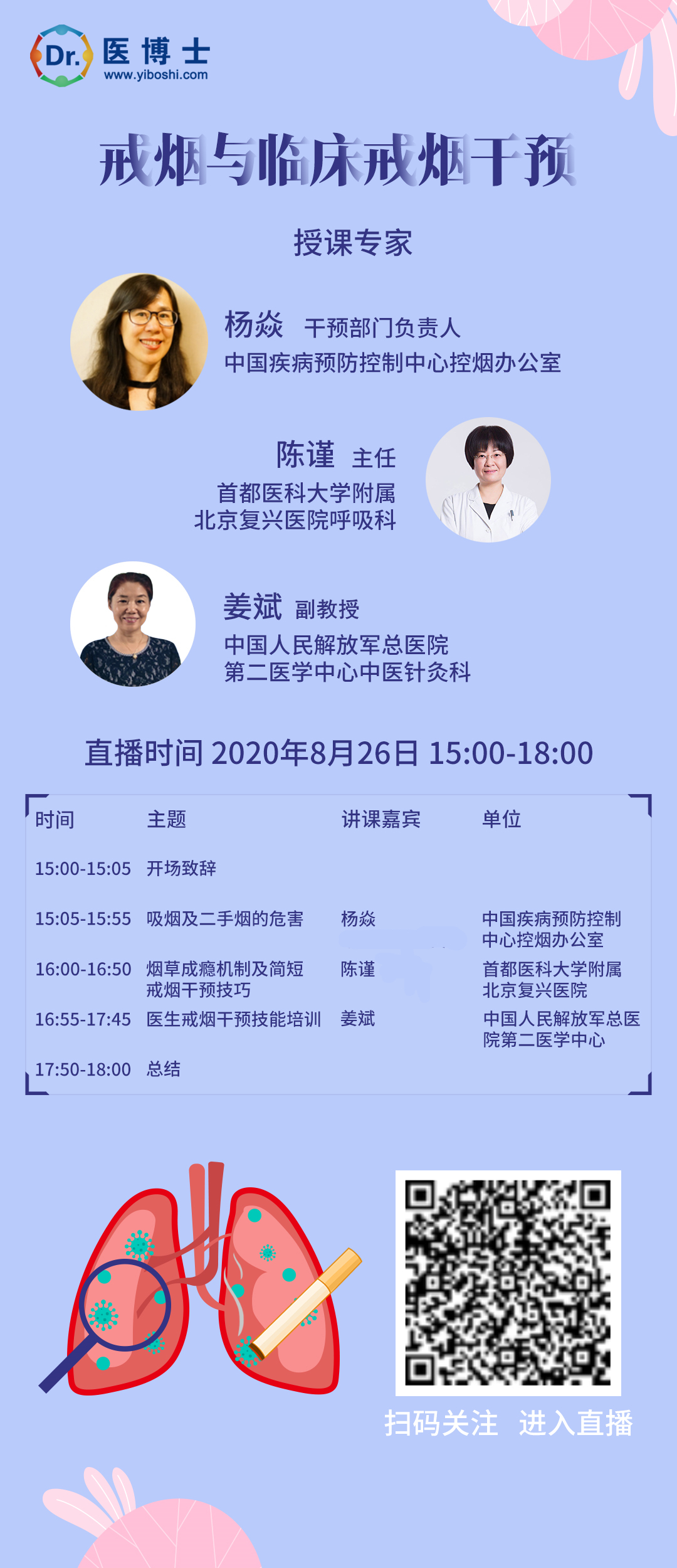 近期,医博士特别邀请中国疾病预防控制中心戒烟办公室杨焱主任、首都医科大学附属北京复兴医院呼吸科陈谨主任、中国人民解放军总医院姜斌教授,推出《戒烟与临床戒烟干预》的直播节目,为广大基层医务人员,进行戒烟及简短戒烟干预最新知识和技能的培训。