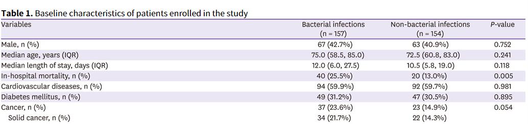 共统计了311名患者,其中157名患者有细菌感染,154名患者无细菌感染,将细菌感染患者分为3个亚组,第一组包括经细菌培养后为阳性的患者,第二组包括临床中诊断为败血症的患者,第三组包括败血症诊断明且微生物培养阳性的患者,患者基线特征见表1。有细菌感染的患者院内死亡率高于无细菌感染患者(25%VS13.0%,p=0.005)。有细菌感染的患者白细胞计数明显高于无细菌感染患者(中位数:13800/mm3VS10400/mm3,p<0.001)。有细菌感染的患者出现全身反应综合征较无细菌患者高(88.5%VS52.6%,p<0.001)。
