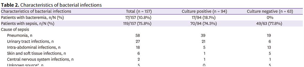 157例细菌感染患者中,有119例(75.8%)被诊断为患有败血症,其中94例(59.9%)患者感染源阳性。感染最常见的部位为肺、泌尿系和腹腔。157名患者中有17名(10.8%)患者的血液培养结果为阳性。157名患者中有5名无法确定感染源,具体见表2。