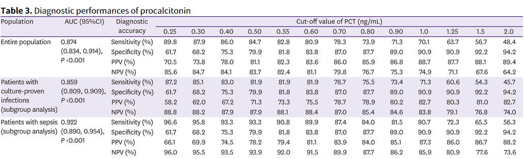 表3显示了诊断准确性,包括PCT水平的敏感性,特异性,阳性预测值和阴性预测值。PCT最佳临界值为0.50ng/mL,灵敏度为84.7%,特异性为79.9%,阳性预测值为81.1%,阴性预测值为83.7%。在脓毒血症的亚组中,PCT的最佳临界值为0.50ng/mL,经过培养证实的感染,脓毒症和微生物培养阳性的患者中,PCT最佳临界值为0.60ng/mL。