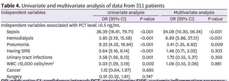 311名患者PCT水平≥0.5ng/mL,在多变量分析中,败血症(几率【OR】=24.08;95%CI:10.30,56.34,p<0.001),血液透析(OR=8.89;95%CI:2.88、27.51,p<0.001)和肺炎(OR=3.41;95%CI:1.35、8.62;p=0.009),见表4。