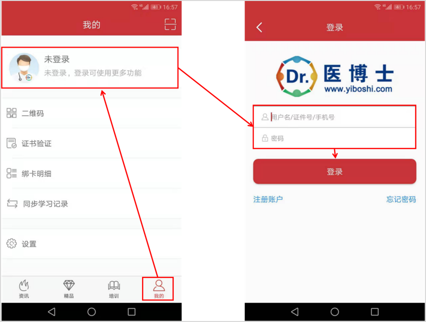 学员进入医博士APP,输入用户名及密码点击登录(尚无账号的学员,可点击“注册账号”进行注册)。未下载医博士APP的用户,可扫描医博士APP下载二维码进行下载,或进入应用商城搜索“医博士”进行下载。