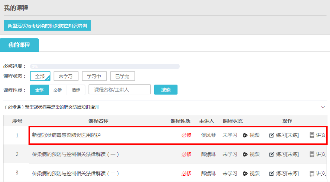 登录成功后,进入学习中心,点击“新型冠状病毒感染的肺炎防治培训”,进入学习页面观看视频。