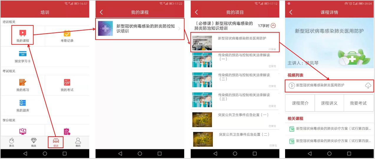 登录成功后,点击“培训-我的课程”,选择“”,点击课程目录,进入“课程详情”,点击课程名称进行课程视频学习。