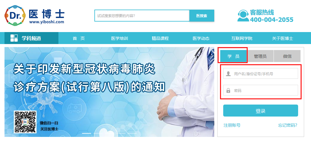 学员打开浏览器,进入医博士网站(网址:http://www.yiboshi.com/),选择“学员”,输入用户名及密码点击登录(尚无账号的学员,可点击“注册账号”进行注册)。