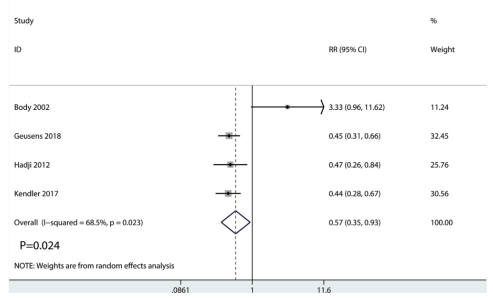 研究结果显示,与双膦酸盐类药物相比,特立帕肽治疗在椎体骨折的发生率方面显示出明显的优势(RR = 0.57,95%CI:0.35~0.93,P = 0.024,图1)。