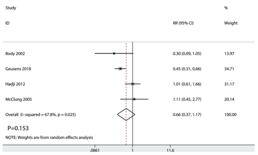 研究者还发现,在非椎体骨折发生率方面,特立帕肽治疗的效果与双膦酸盐治疗相当(RR = 0.66,95%CI:0.37~1.17,P = 0.153,图2)。