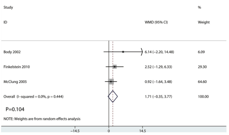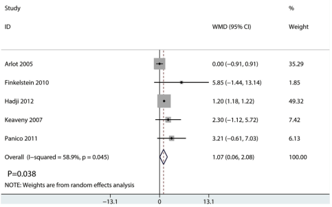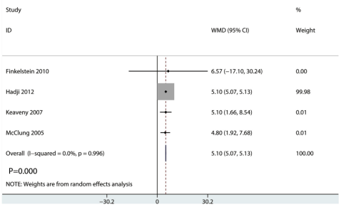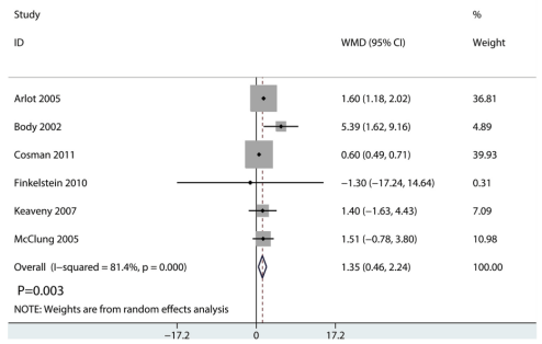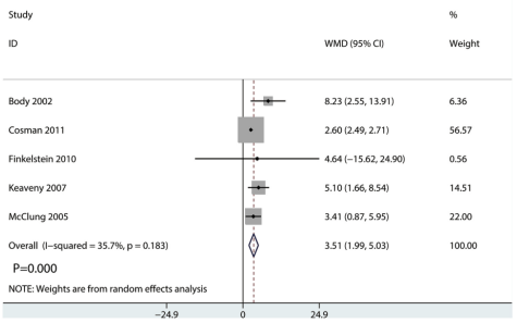 研究小组发现,与双膦酸盐治疗相比,特立帕肽治疗改善了腰椎骨密度(治疗6个月后:WMD = 1.35,95%CI:0.46~2.24,P = 0.003,图3;治疗12个月后:WMD = 3.51,95%CI:1.99~5.03,P = 0.000,图4;治疗18个月后:WMD = 5.10,95%CI:5.07~5.13,P = 0.000,图5)。