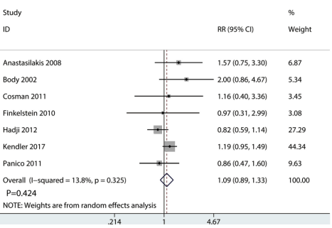 在不良反应发生率方面,特立帕肽和双膦酸盐相比无统计学差异(RR = 1.09,95%CI0.89~1.33,P = 0.424,图8)。