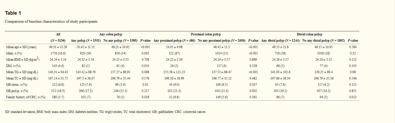 回顾性分析了2008年1月至2008年12月之间在长庚医院3136名体检患者,检查项目包括结直肠镜和肝胆脾彩超。人口统计学包括患者的年龄,性别,结直肠癌家族史,甘油三酯及胆固醇水平。将符合纳入标准的患者分为三组:近端结肠息肉、远端结肠息肉和全结肠息肉,通过病理报告对每个亚组进行再次分类及分析,如图1所示。