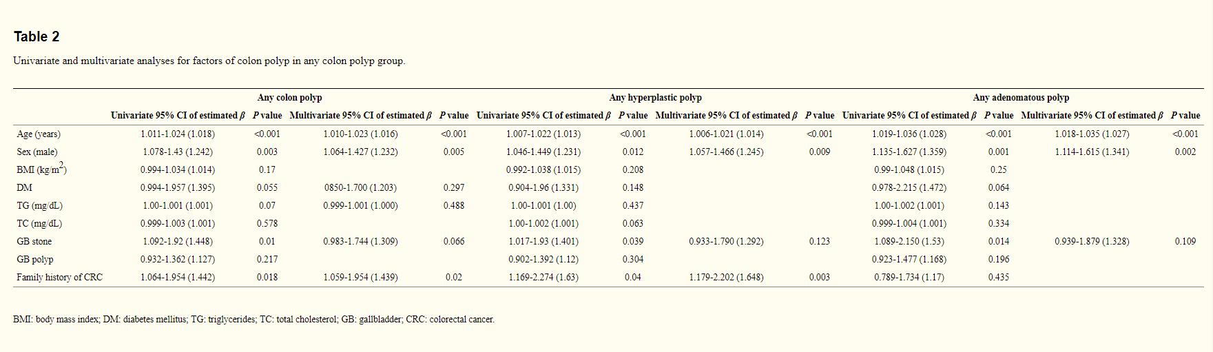 所有患者行肠镜检查前均服用复方聚乙二醇电解质溶液,检查过程中准确记录了每个息肉的大小,位置及数量。行肠镜检查的次日,再行腹部彩超检查,检查项目包括肝脏,胆囊,胰腺,脾脏及肾脏。统计学方法包括卡方检验,t检验,回归分析,单变量分析及多变量分析,认为P<0.05具有统计学意义。