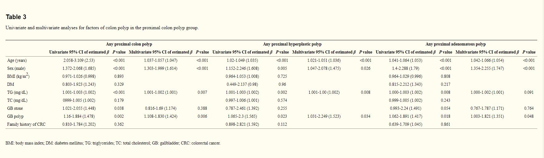 近端结肠息肉的单因素和多因素分析结果表明,年龄、男性和较高的甘油三酯水平、胆囊息肉的存在与近端结肠息肉的发生有统计学意义,且呈正相关性(OR:1.424;p=0.006)。胆囊结石与近端结肠息肉无统计学意义(OR:1.174;P=0.338)。增生性息肉与年龄、性别,甘油三酯水平,胆囊息肉的相关参数正相关;腺瘤性息肉只与男性,性别和胆囊息肉的相关参数呈正相关。未发现胆囊结石与任何近端增生性息肉和近端腺瘤性息肉相关,见表3。