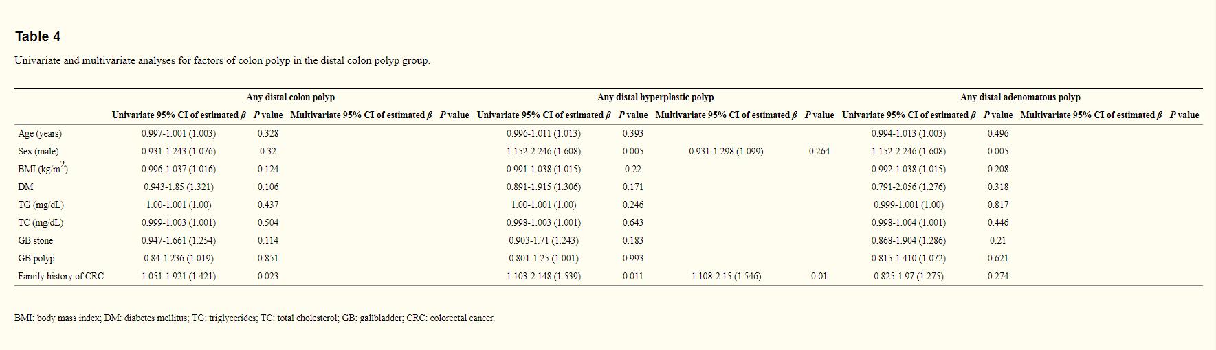 表4 远端结肠息肉的单变量和多变量分析