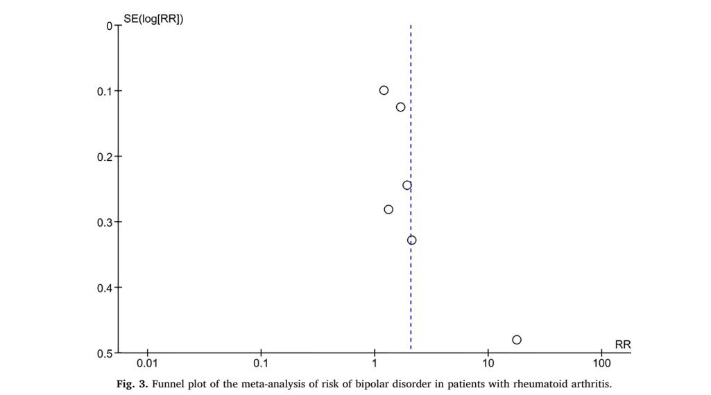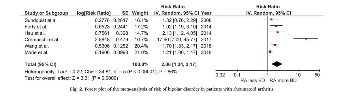 该研究是第一项关于RA患者发生双相情感障碍风险的系统综述和Meta分析。结果显示RA患者发生双相情感障碍的风险较高。这可能是因为:(1)RA患者有功能残基,生活质量较低,容易发生精神疾病。(2)RA和双相情感障碍有相同的易感基因。(3)RA患者可能存在HPA轴紊乱。