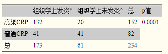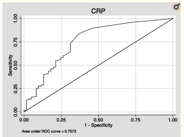 对173例阑尾炎和61例正常阑尾患者进行C反应蛋白检测,41例(24%)阑尾炎中C反应蛋白正常,而132例(76%)阑尾炎患者C反应蛋白升高;61例非阑尾炎患者中,41例(67%)患者C反应蛋白正常,20例(33%)患者C反应蛋白升高。发生阑尾炎患者的C反应蛋白平均值59.2,而非阑尾患者为22.5,具体见表2。通过C反应蛋白诊断阑尾炎的敏感性为76%,特异性为67%,ROC曲线下面积为0.72,C反应蛋白阳性预测值(PPV)为87%,阴性预测值为50%,具体见图1。