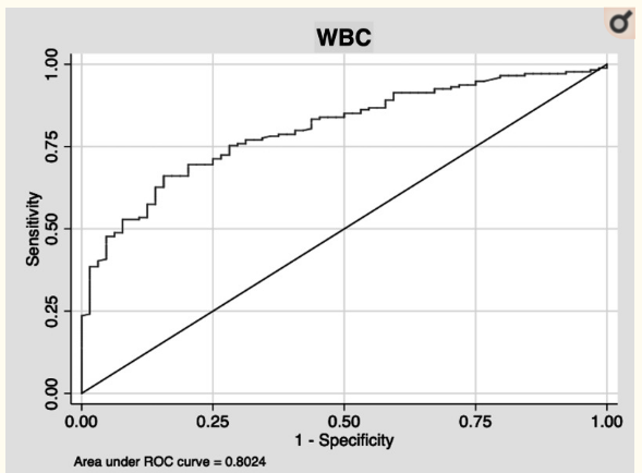 175例阑尾炎患者中有174例患者行全血细胞计数分析,66例正常阑尾炎患者中有64例患者行全血细胞计数分析。174例中的43例(25%)患者白细胞计数正常,其中2例(1%)低白细胞,129例(74%)白细胞计数升高。64例非炎性阑尾患者中,有40例(63%)患者白细胞计数正常,有24例(37%)患者白细胞升高。炎性阑尾和正常阑尾的白细胞计数平均值为15.1和10.2,具体见表3。通过白细胞诊断阑尾的敏感性为75%,特异性为63%,ROC曲线下面积为0.69,白细胞阳性预测值为85%,阴性预测值为48%,具体见图2。