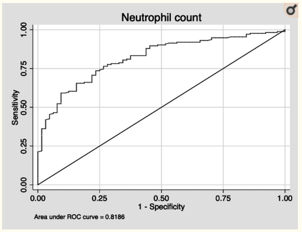 175例阑尾炎患者中31例患者(18%)中性粒细胞计数正常,而143(82%)例患者中性粒细胞计数升高。64例非阑尾炎性患者中,40例(63%)患者中性粒细胞正常,而24例(37%)患者中性粒细胞升高;炎性阑尾与非炎性阑尾中性粒细胞计数平局值为12.4和7.1,具体见表4。通过中性粒细胞计数诊断阑尾炎的敏感性为82,特异性为63%,ROC曲线下面积为0.72,中性粒细胞阳性预测值为86%,阴性预测值为56%,如图3所示。