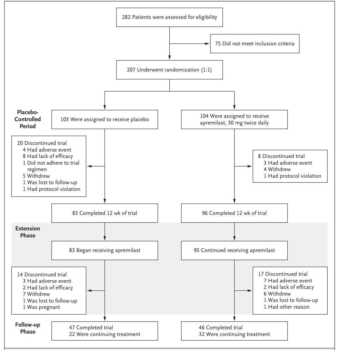 该研究纳入了207例白塞氏综合征合并口腔溃疡患者,患者随机接受阿普斯特(每天2次,每次30mg)治疗(n=104),或接受安慰剂治疗(n=103)。阿普斯特组年龄(39.4±12.1)岁;女性63例;白塞氏综合征病程(6.7±7.4)年;口腔溃疡(61.2±27.6)个。安慰剂组年龄(40.6±12.7)岁;女性63例;白塞氏综合征病程(6.9±8.0)年;口腔溃疡(60.8±26.9)个。该研究的流程见图1。