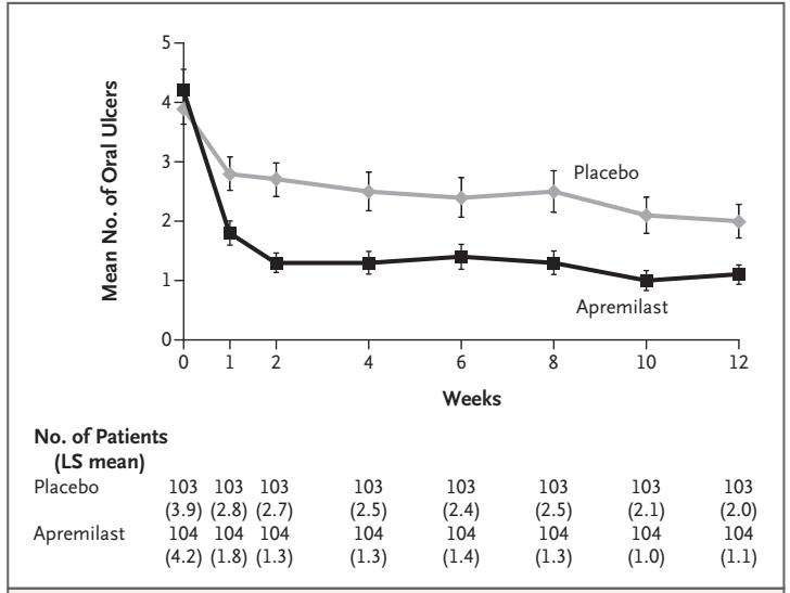为了观察阿普斯特对白塞氏综合征患者口腔溃疡的治疗效果,伊斯坦布尔大学Hatemi等开展了一项3期临床试验,结果于近期发表在The New England journal of medicine杂志上。研究者发现,阿普斯特可以减少口腔溃疡数量,改善患者生活质量。