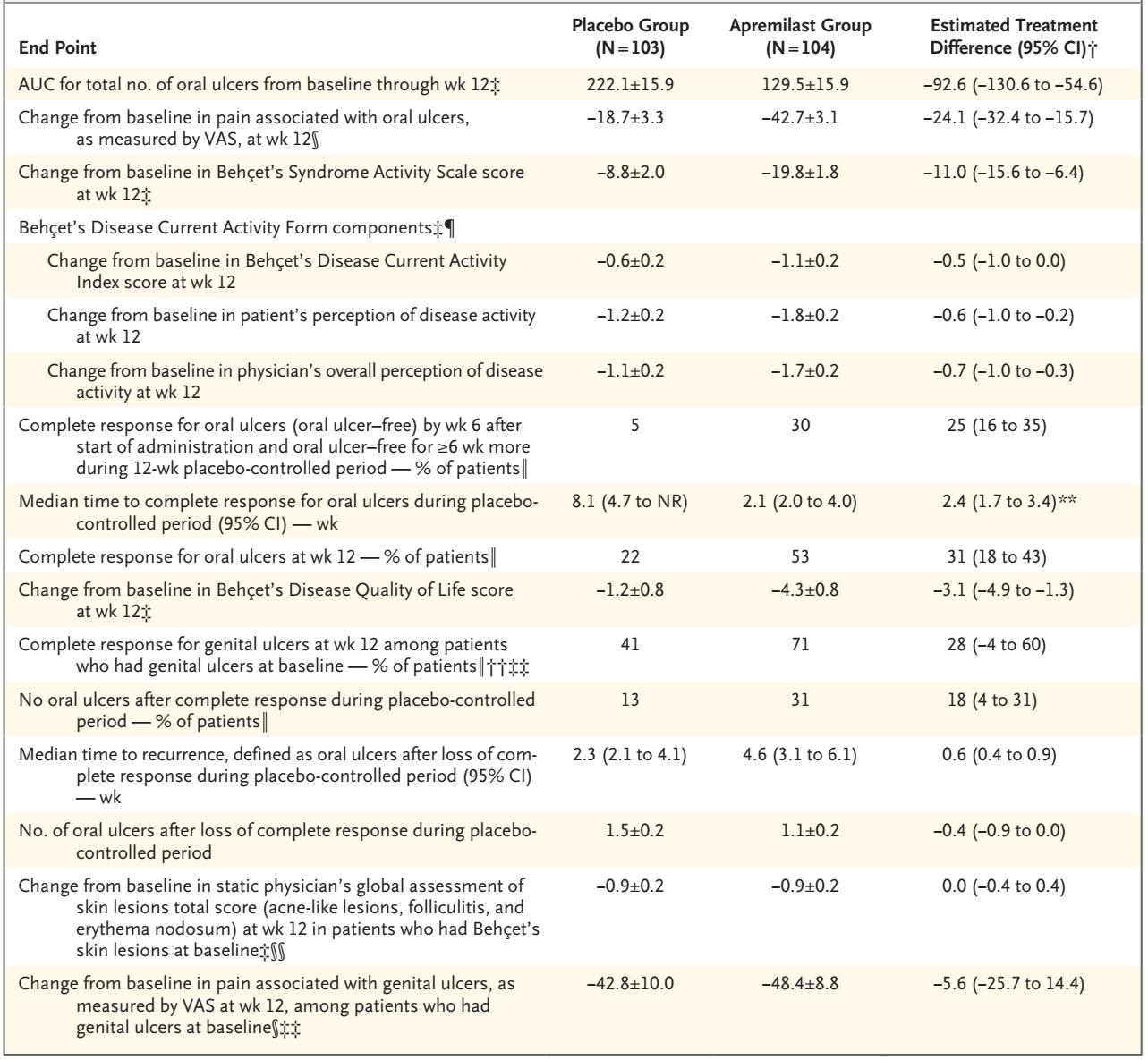 该研究主要终点是口腔溃疡总数,次要终点为口腔溃疡的完全缓解、与口腔溃疡有关的疼痛、疾病活动以及白塞病生活质量评分(评分为0~30分,分数越高,生活质量越差)。