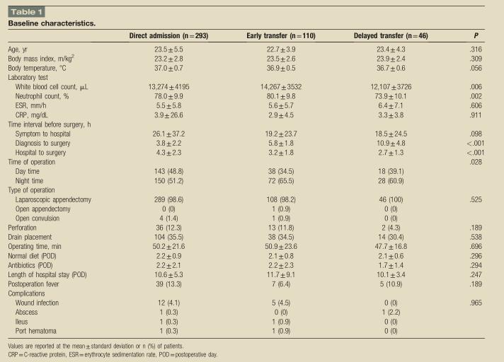 共有449例患者纳入研究,直接住院293例,早期转移入院110例,延迟转移入院46例。每组从发病开始到手术时间及从住院到手术时间情况见表1。早期手术和转移延迟组平均术前时间为2.6±0.7h和8.3±4.7h。三组患者年龄,发生症状到住院时间,体温,BMI,ESR和CRP水平相似。与其他组相比,延迟转移组患者的白细胞计数和中性粒细胞计数较低。早期和延迟转移组中,手术多集中在傍晚5点半之后,直接入院组从诊断到手术时间较短,三组之间并无统计学差异。