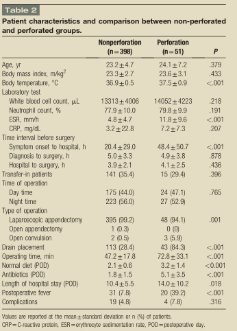 共有51例患者(11.4%)患者术中发现阑尾穿孔,穿孔性阑尾炎患者症状明显,体温升高明显,需更长的手术时间,穿孔的患者中并发症的相关愈后因素更为严重,具体见表2。