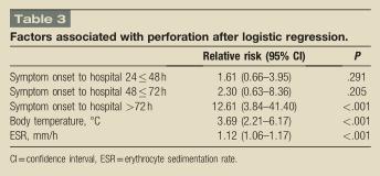 逻辑回归分析,评估穿孔危险因素。患者的体温(比值3.69,置信区间:2.21-6.17;p<0.01),ESR(比值=1.12;95%置信区间:1.06-1.17;p<0.001)与穿孔明显相关。从症状开始到住院时间,超过72小时的患者有统计学意义(比值=12.61;95%置信区间:3.84-41.40;p<0.001),具体见表3。
