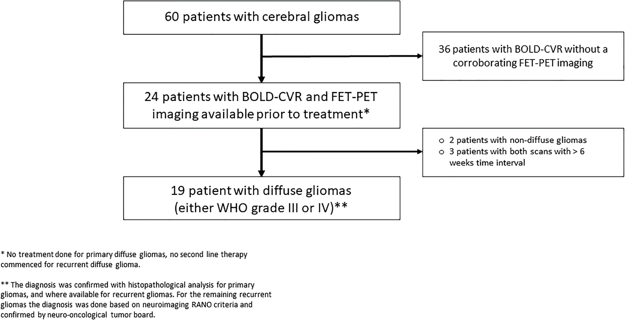 从前瞻性的“BOLD-CVR数据库”中,抽取60例在首次诊断为肿瘤或诊断为肿瘤复发时接受了BOLD-CVR成像的胶质瘤患者。60名胶质瘤患者中,有24名患者在治疗前进行了BOLD和FET-PET成像(对原发性弥漫性胶质瘤不进行治疗(即不进行手术),对复发性弥漫性胶质瘤不进行二线治疗),时间为6周。两名非弥漫性胶质瘤患者和三名BOLD-CVR和PET扫描间隔>6周的患者被排除在研究之外。18名有19个数据集,1名患者因肿瘤复发接受了两次协议重新签署。