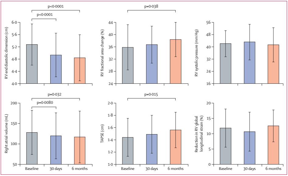 治疗后右室舒张末期直径(RV end diastolic dimension)、右室部分面积变化率(RV fractional area change)、右心房容积(Right atrial volume)、三尖瓣环平面收缩偏移(TAPSE)均明显改善,而右室收缩压力(RV systolic pressure)、右室球部纵向应变减少(Reduction in RV globaongitudinal strain)未见明显改善,见下图。