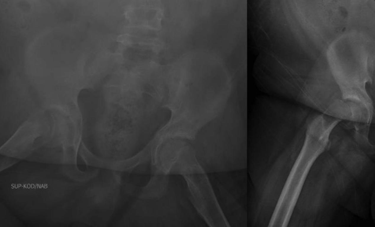 一名19岁男子因过去两周内出现右髋疼痛及无法行走被送至急诊室接受评估。患者既往无行走困难,其病史包括歌舞伎综合征、肥胖症、发育迟缓、自身免疫性溶血性贫血、特发性血小板减少性紫癜和需要进行心脏直视手术的右心室双出口。我们的机构对病人进行了密切跟踪,包括内分泌学的评估。病人没有已知的内分泌失调。在没有发现任何内分泌紊乱的情况下,进行了全面的实验室和遗传学研究。体检时,患者右腿外旋。右髋的任何运动都会引起剧烈的疼痛和保护动作,限制了检查。患者使用拐杖页无法走动。