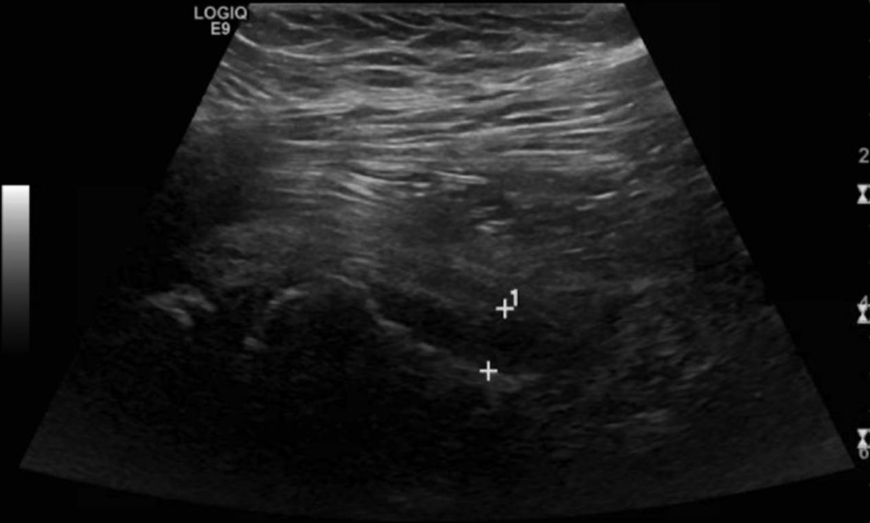 骨盆和右侧髋关节的x线片显示右侧SCFE,骺骨干角度(Southwick角)为75°(图1)。超声检查显示右侧髋关节积液(图2)。这些图像和检查证实患者目前诊断为急性严重不稳定的SCFE。病人在手术室进行了前Smith-Peterson入路,并进行了囊膜切开术,显示出有关节出血的情况。在干骺端前部轻轻按压复位。在干骺端放置两个空心螺钉以保持复位。对侧髋关节也被预防性固定非典型SCFE(图3)。
