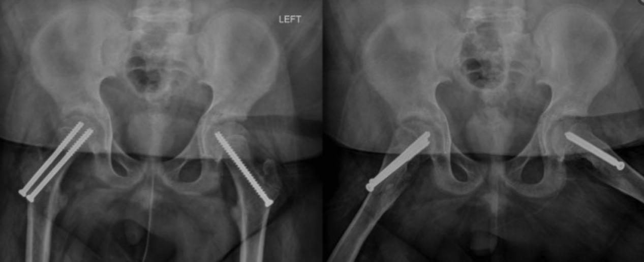 患者在6周内右侧髋关节不负重,同时在左侧保持可耐受的负重。术后8周开始独立行走。术后7个月随访,患者恢复正常,x线片未见股骨头坏死征象。双侧股骨近端的股骨仍然开放。