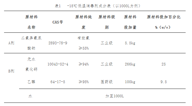 (一)低温消毒剂(-18℃)。包括二氯异氰尿酸钠、氯化钙和乙醇。现场使用时,-18℃低温消毒剂中有效氯浓度为0.3%(3000mg/L),无水氯化钙的含量为25%,乙醇的含量为9.5%。详见表1。
