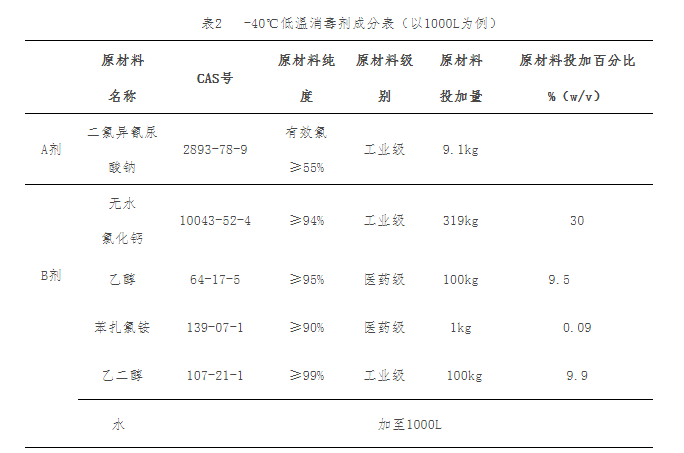 (二)低温消毒剂(-40℃)。包括二氯异氰尿酸钠、氯化钙、乙醇、乙二醇和苯扎氯铵。现场使用时,-40℃低温消毒剂中有效氯浓度为0.5%(5000mg/L),无水氯化钙的含量为30%,乙醇9.5%,乙二醇9.9%,苯扎氯铵0.09%。详见表2。