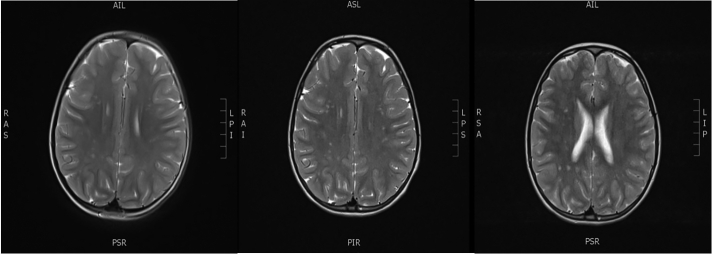 由于核磁共振检查怀疑是缺血性病变,她被转诊到儿童神经科。6岁8个月时的神经系统检查显示中枢性张力减退、意图性震颤和膈肌收缩障碍。全身体格检查未见其他明显发现。由于在核磁共振成像上怀疑有缺血性病变,所以进行了一系列高凝状态检查,结果正常。心电图、超声心动图、经颅多普勒检查均正常。