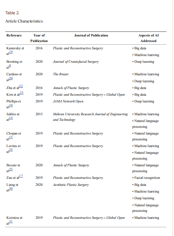 初始搜索收入了129篇相关文献,其中89篇为较新颖的文章。但是审查中发现,有65篇未解决AI在整形外科领域中的应用问题,另24篇中又排除了10篇废物英文文章或无法进行全文评审的文章。因此共14篇符合纳入鸡排除标准,详见下表。