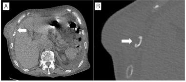 图1. 计算机断层扫描。A:胸壁肿块,约65 × 30 mm。B:右第8肋有溶骨性改变。