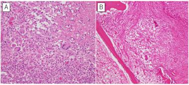 图2. 苏木精伊红染色(放大200倍)。非干酪样上皮样细胞肉芽肿伴多核巨细胞形成。肉芽肿性病变浸润骨皮质